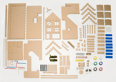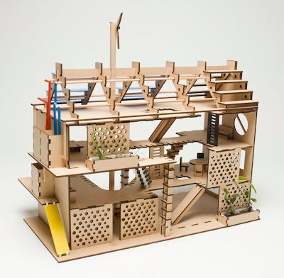 The components for the the house can be flat packed, and are laser cut from a space filling template, reducing the amount of wood required. It can be constructed by child or parent easily via a notching system and without the use of glue. The packaging includes environmentally friendly paint, so the basic initial appearance of the house can individualised and given a unique identity. The design is modular and staircases and ladders, green walls, roofing and even entire floors are re-arrangeable, becoming movable elements with which to play. This is conceived as a metaphor for sustainability and flexible living.