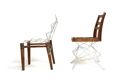 One old chair was cut apart and rebuilt into 2 chairs with the addition of one material, 6mm steel rod. This was a method of repair, but also a way to forge new a new identity for an object made anonymous by the passing decades.